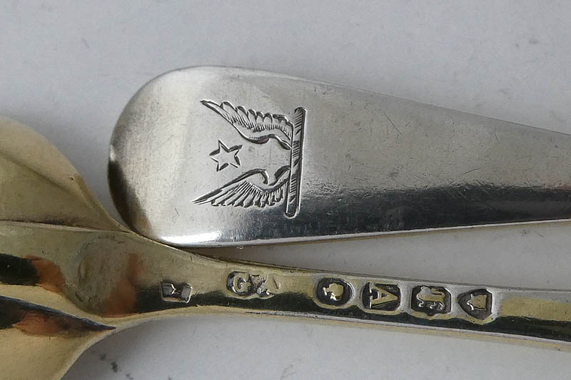 A George III pair of unusually small Fiddle pattern saltspoons (7.5 cm long) made in Birmingham in 1818 by Joseph Wilmore, crested for Almack of Suffolk.