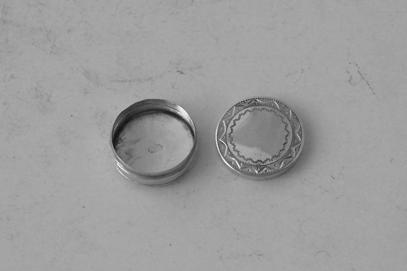 A George III circular patchbox with bright-cut decoration made in Birmingham in 1816 by Samuel Pemberton (marked on both lid and base). Price: £210.00