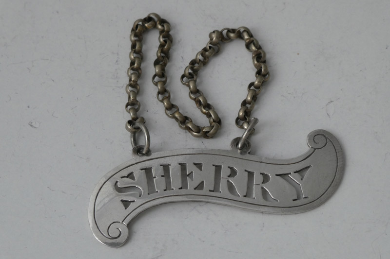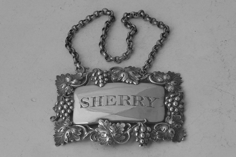 A Victorian wine label with pierced grape border engraved for SHERRY made in Birmingham in 1837 by Joseph Wilmore. Price: £145.00