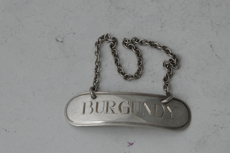 A George IV wine label decorated with bacchic revellers pierced for BOURGONE made in London in 1824 by John Reily. Price: Pages 74 to 78 of Wine labels 1730-2003 edited by John Salter (2004) describe this model and figure 287 illustrates an example of a similar model made in 1821 by George Pearson. This label carries an alternative spelling of Burgundy.