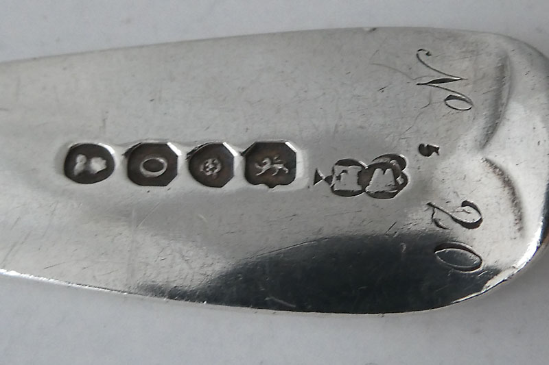 A George III Old English dessert spoon made in London in 1801 by William Eley and William Fearn engraved {George Wombell, born Nov. 10 1801, Baptized July 20th 1804, Sponsors: Thomas Kingston, Charles Atkins, Sophia Ragsdale'}. Price: £145.00 The engraved inscriptions on christening gifts come in many forms. The majority have initials and perhaps a date but this example is of a rarer form (especially for a piece this size) as it carries much more information about the child and even the sponsors. The genealogical records show that George Wombell was born, as the spoon records, in Newark in 1801. He was the son of John Wombell and Matilda Ragsdale and was christened in 1804 (again in Newark) with his aunt Sophia as his godmother. George is listed as a chymist (sic) in Penistone, Yorkshire in a trade directory of 1828 and married Anna Maria Turner there on the 17th of February of that year. The couple went on to have 7 daughters and one son all born in Yorkshire. In 1841 George was listed in the census as a chemist in Ecclesfield, Yorkshire and in 1851 as a veterinary surgeon resident in Hope in Derbyshire. He died in Ecclesfield in 1860 and Anna Maria died in 1864 (also at Ecclesfield). Provenance: A. B. L. Dove FSA |