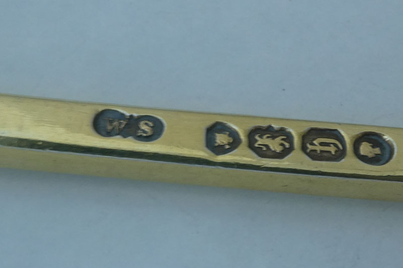 A George III Old English pattern dessertspoon, by Stephen Adams London c. 1785 , initialled {WEM} . This dessertspoon can be dated to after 1781, when the marks were moved to the top of the stem. It is interesting to note that the workman in the assay office left the space for the full stub including the date letter (and the duty mark if the spoon was manufactured post 1784) but appears to have applied the part stub in error. |