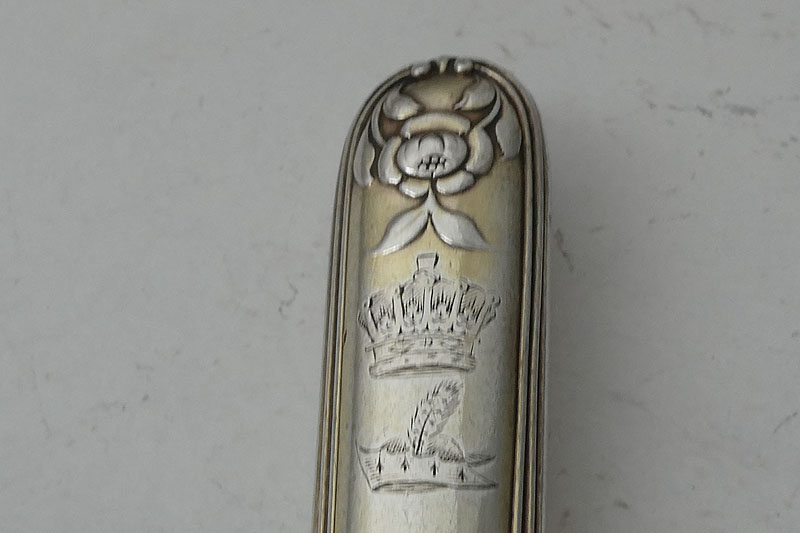 Six George III Threaded table knives made in London in 1799 , engraved with the crest, coronet and Orders of the Garter and St. Patrick for Edward, Duke of Kent (1767-1820) on the ends. Price: £725.00 The combination of the badge and coronet of one of the younger sons of George III with the Orders of the Garter and St. Patrick shows that these knives were owned by Edward, Duke of Kent (1767-1820). He was invested with the Order of St. Patrick in 1783 (he was one of the founding knights) and that of the Garter in 1786. Edward was a career soldier who began his military service in 1785 before completing his education in Geneva where he also joined the Freemasons in 1789. In 1789 Edward was appointed colonel of the 7th Regiment of Foot (the Royal Fusiliers) but in 1790 he returned without leave and was sent off to Gibraltar as an ordinary officer. From 1791 to 1802 Edward was Commander-in-Chief for North America, based in Canada, and in 1799 was created Duke of Kent. The Duke was Governor of Gibraltar in 1802, but recalled to Britain in 1803, after a mutiny. He retained the Governor's post until 1820 but was not allowed to return to Gibraltar. Following the death of Princess Charlotte (George III's only legitimate grandchild) in 1817 all of George III's unmarried sons were encouraged to marry and produce heirs. The Duke of Kent married Princess Victoria of Saxe-Coburg-Saalfield in 1818 and the couple had a daughter, Alexandrina Victoria, in 1819 and who inherited the crown in 1830 and ruled, as Queen Victoria, until 1901. The Duke, who had been very healthy, died of pneumonia in 1820. A set of six forks (stock number 9518) can be found on Antique silver forks.