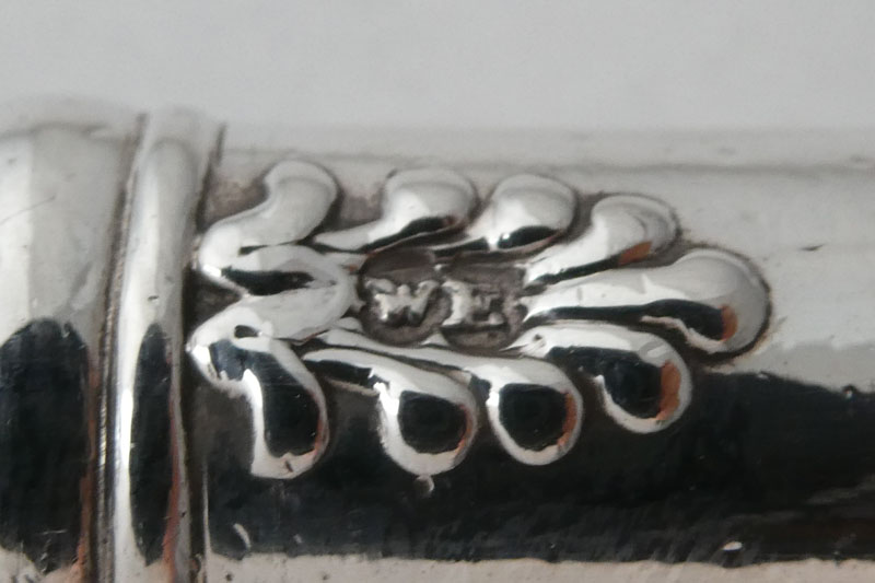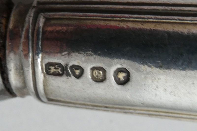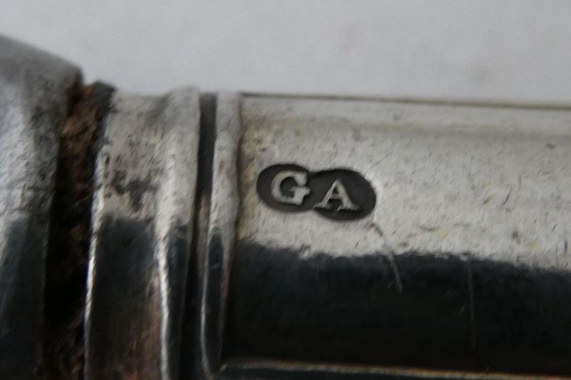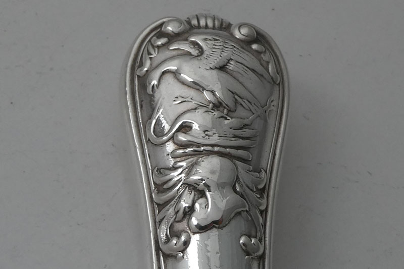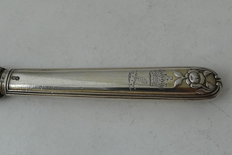 A William IV Scottish Rococo end King's pattern table knife with private die crest for the Graham family made in London in 1837 by William Eaton. Price: £95.00 This knife was apparently designed to be used with the service commissioned by a member of the Graham family from Robert Gray and Sons (see entry 10 in the appendix to Private Die-Struck Heraldic Flatware 1780-1900 by Luke Delmas and Luke Schrager published in Silver Studies [2022] and The Finial [2023]). It is interesting to note that no knives are apparently noted by Gray and Sons suggesting that they employed William Eaton to make this part of the service. The apparent discrepancy in the dates between these knives and the noted Glasgow pieces would seem to be due to the differing dates that the Glasgow assay office changed its date letter as opposed to London doing so on the 29th of May.
