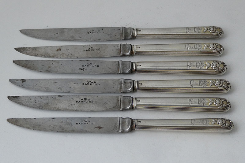 A set of six Victorian dessert or fruit knives in a Rose pattern variant with original steel blades (marked by Garrards), made in London in 1851 by George Adams (for Chawner and Company), crested for the Earl of Sefton. Price: £495.00 There is evidence in an internal list of dies now in the Goldsmiths' Company Library of a commercial link between Chawner and Company (run from 1840 to 1881 by George Adams) and Garrards. The list does not seem to name this pattern but also does not list dies for knife handles in most patterns. It is therefore possible to suggest that Chawner and Company themselves outsourced the manufacture of these knives to another firm. Charles William Molyneux, 3rd Earl of Sefton, (1796-1855) inherited the Earldom and family estates from his father in 1838. Molyneux had been educated at Eton and Christ Church, Oxford (although he did not graduate from the latter) and served as Member of Parliament for South Lancashire from 1832 to 1834. That year he married Mary Augusta Gregge-Hopwood (1814-1906). He died in 1855.