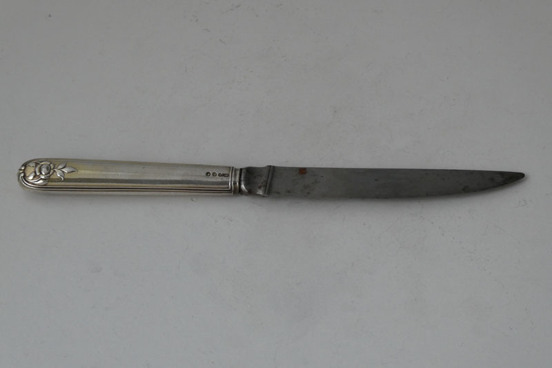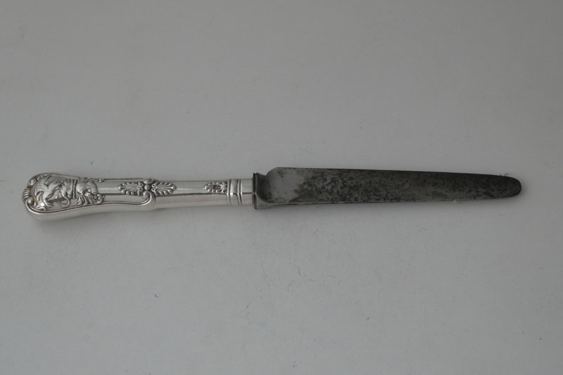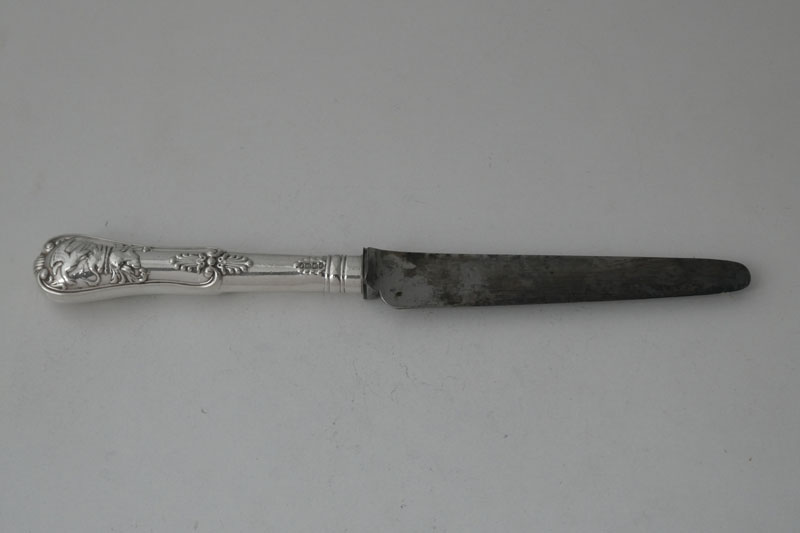 A George III King's pattern child's or small dessert knife (19.7 cm long) made in London in 1820, the handle being marked by Robert Peppin and the blade by William Eley and William Fearn in 1818, initialled {AAC}.