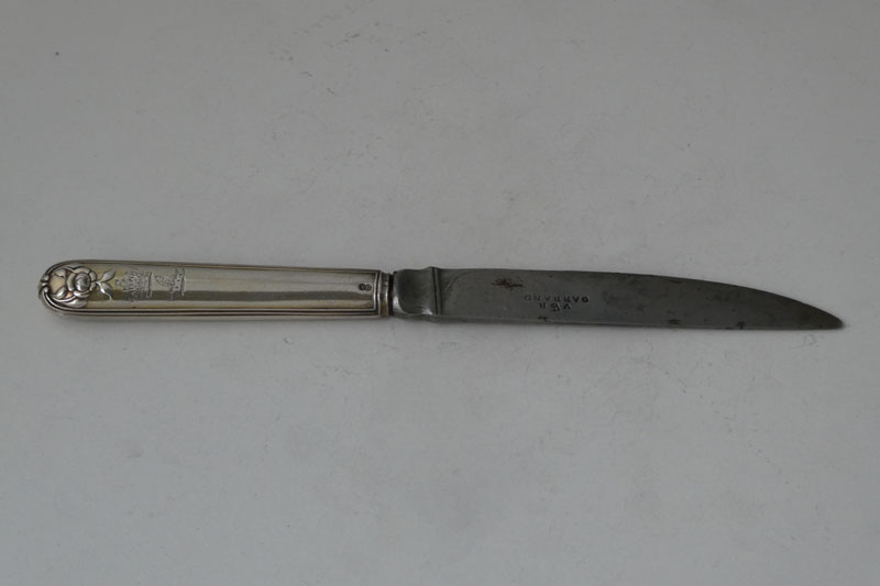 A Victorian dessert or fruit knife in a Rose pattern variant with original steel blade (marked by Garrards), made in London in 1851 by George Adams (for Chawner and Company), crested for the Earl of Sefton. Price: £55.00 5 individual knives available (in addition to a set of six- Stock number 1001). There is evidence in an internal list of dies now in the Goldsmiths' Company Library of a commercial link between Chawner and Company (run from 1840 to 1881 by George Adams) and Garrards. The list does not seem to name this pattern but also does not list dies for knife handles in most patterns. It is therefore possible to suggest that Chawner and Company themselves outsourced the manufacture of these knives to another firm. Charles William Molyneux, 3rd Earl of Sefton, (1796-1855) inherited the Earldom and family estates from his father in 1838. Molyneux had been educated at Eton and Christ Church, Oxford (although he did not graduate from the latter) and served as Member of Parliament for South Lancashire from 1832 to 1834. That year he married Mary Augusta Gregge-Hopwood (1814-1906). He died in 1855.