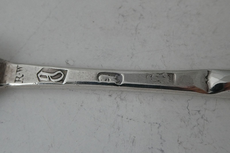 A George II marrow spoon with shell back made in London in 1759 by Richard Hawkins. Price: £295.00 Richard Hawkins was born in 1726, the son of Richard Hawkins and his wife Ann, and became a member of the Goldsmiths' Company by patrimony in 1748. In 1753 Hawkins had transferred to him the last two apprentices from the workshop of noted spoonmaker Marmaduke Daintrey and appears again in the records of the Goldsmiths' Company in 1755 and again in 1763. In 1764-1765 there is evidence that Hawkins disbanded his workshop and ceased manufacturing. Further details about Richard Hawkins can be found in 'Recent research into the Missing Registers' on pages 62-65 of Silver Society Journal 10 (1998) by Luke Schrager.
