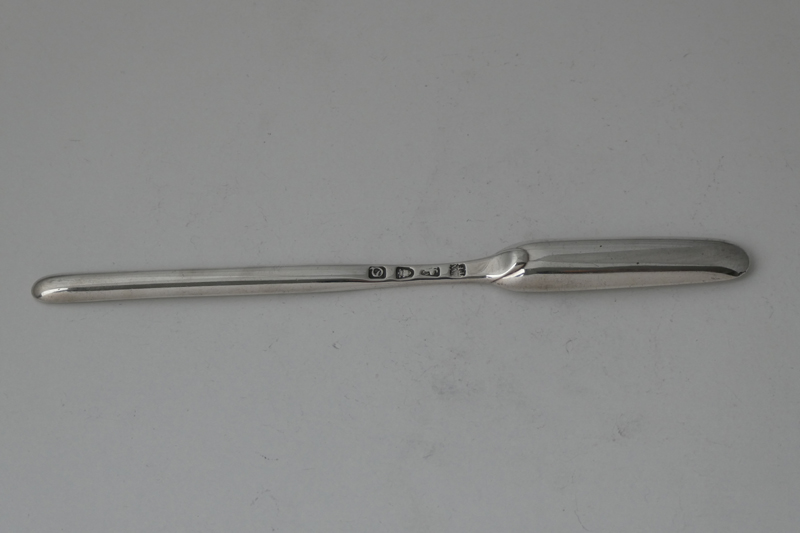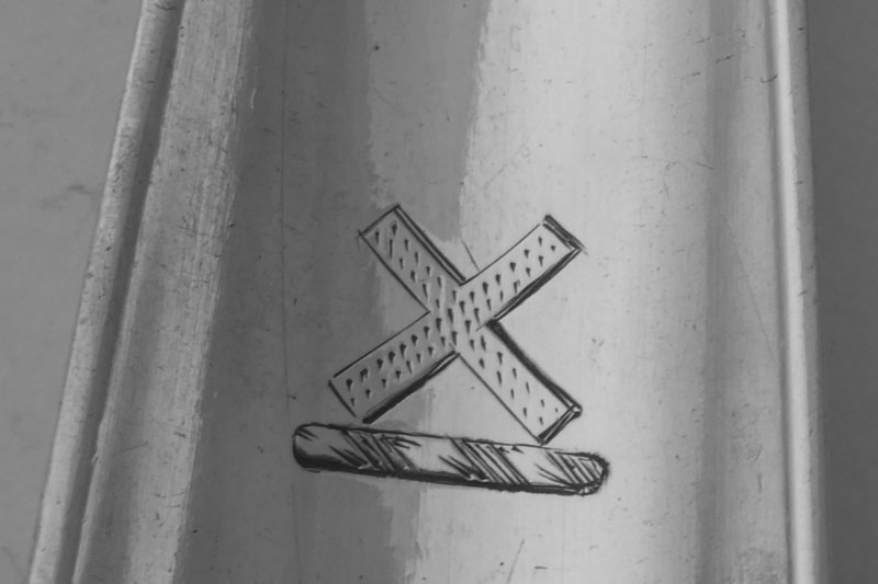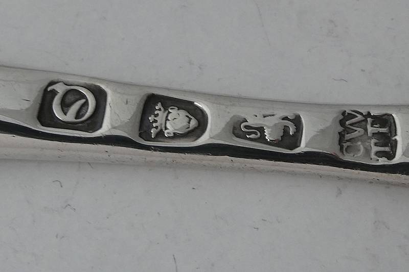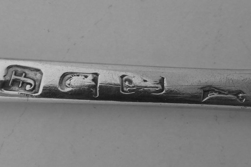 A marrow scoop, by John Langlands I of Newcastle struck with indented lion passant (used from 1759-1778), circa 1765 crested for Peers and initialled {H} . The indented lion passant was used in London between 1739 and 1755 but it is also found on silver assayed in Newcastle between 1759 and 1778. Newcastle silver of the period where the indented lion was used is also found with the more conventional square lion. This combined with the much lower volume produced by this assay office than London makes Newcastle silver with the indented lion a significant rarity. |