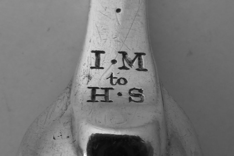 A marrow scoop made in London in 1724 with indistinct maker's mark and a small additional 'P' engraved with complex monogram. This small 'P' mark is usually associated with the Scarlett family of spoonmakers |