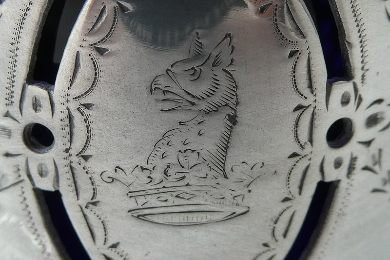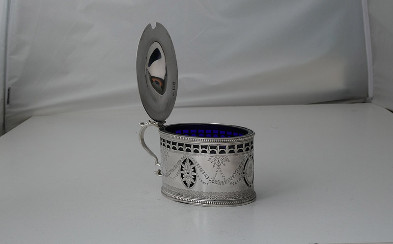 An unusually generous oval mustard pot (11.7cm long) with bright-cut engraving and beaded borders made in London in 1912 by Anderton and Otto (also marked on the lid) crested with a bull's head. Price: