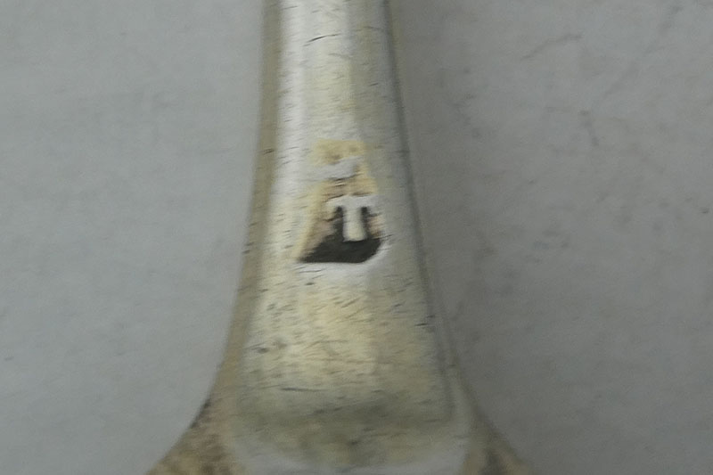 A George I Hanoverian pattern tablespoon with rat-tail made in London in 1718 (unusually struck in error with two leopard's heads rather than a leopard's head and a figure of Britannia) by Henry Clarke, initialled {M [over IE}. Price: £365.00 In 1718 the punches at the London Assay Office were still individual ones and the official who hallmarked this spoon made two clear impressions of the same punch.