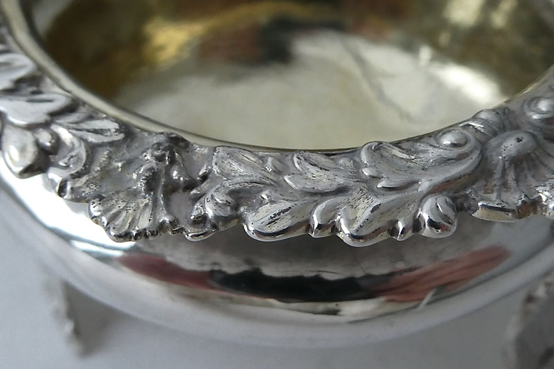 An embossed salt on pedestal foot with flower encrusted border and blue glass liner by William Barrett, London 1829. Price: £185.00 |