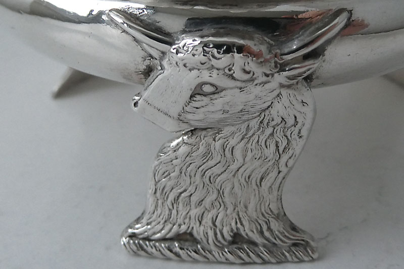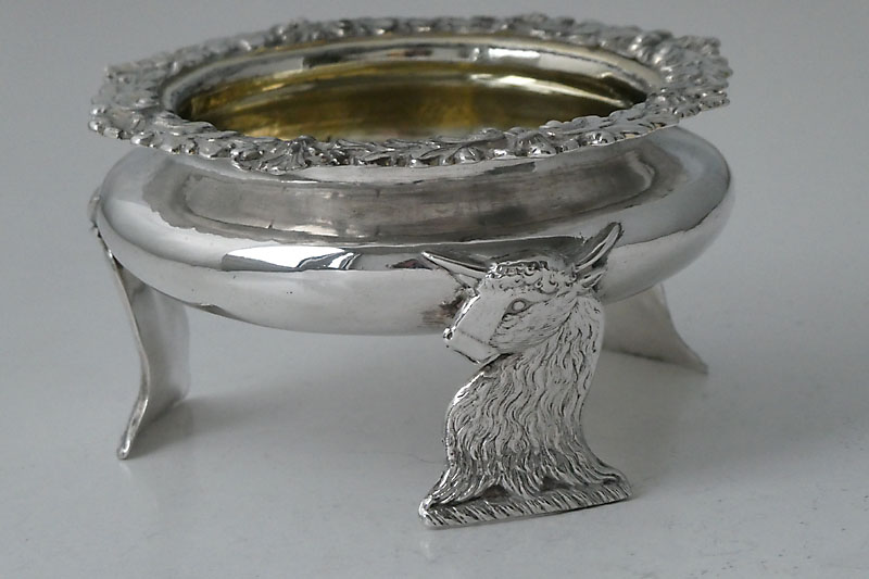 A George IV circular salt cellar with cast border and three heraldic legs formed as bull's heads erased, made in London in 1825 by James Aldous. Price: £345.00