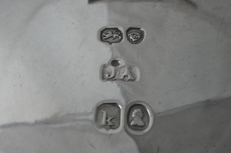 A set of four George III oval salts with beaded borders to body and foot, by John Wakelin and William Tayler London 1782 (one struck with maker's mark four times in place of hallmarks), initialled {WAS} within a cartouche . Price: ![]() |