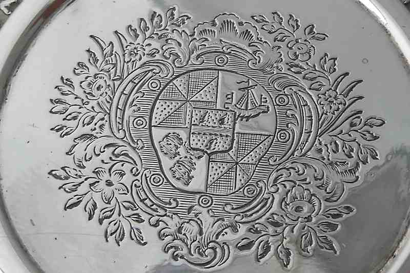 A shaped teapot stand on ball and claw feet with bright-cut decoration, by Henry Green (overstamping Charles Aldridge) London 1786, crested with a martlet holding a cross crosslet fitchy . Price: £445.00 |