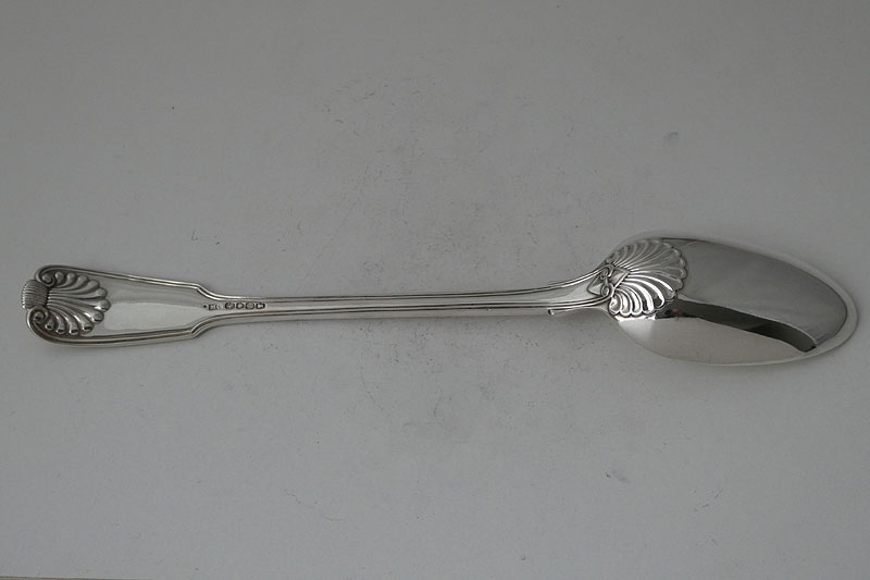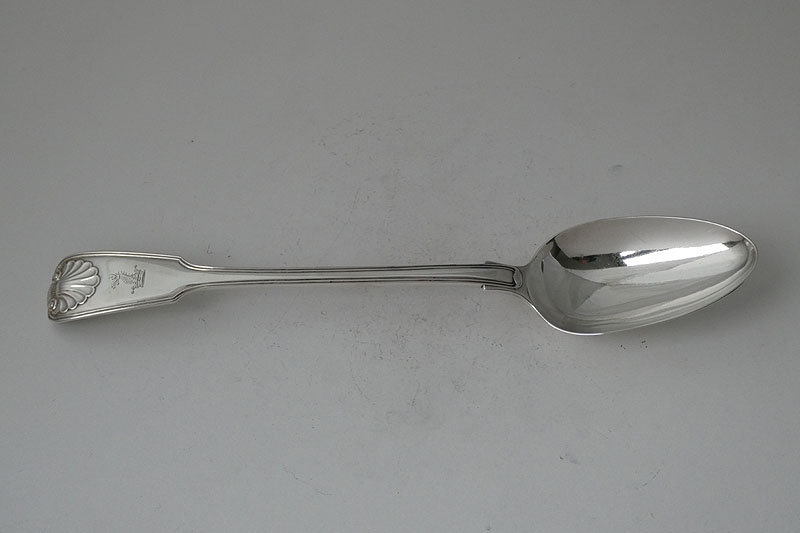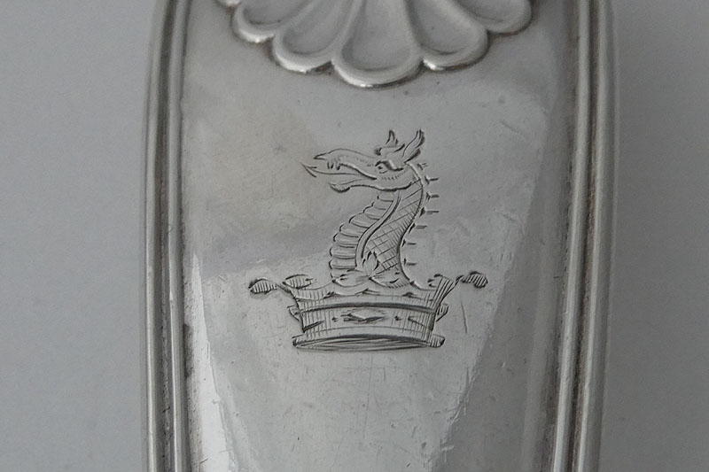 A Victorian Fiddle Thread and Shell stuffing spoon of unusual gauge (just over 6.5 Troy ounces) with diamond point heel made in London in 1838 by Mary Chawner, crested with a dragon's head out of a coronet. Price: £525.00