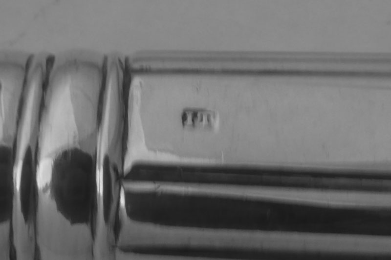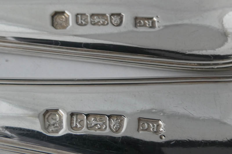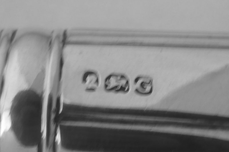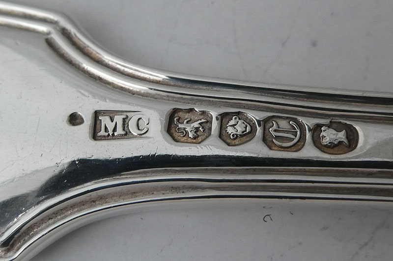 A Victorian Old English pattern stuffing spoon, by David Reid Newcastle 1856, engraved with an initial B and 'IN MEMORY OF W. K. REID II OB. 27th May 1855' . The memorial on this inscription relates to William Ker Reid II (1832-1855). Reid was the twelfth child and seventh son of London goldsmith William Ker Reid I (1787-1868) and Mary Barnard (1792-1845), daughter of London goldsmith Edward Barnard I. W. K. Reid II was also the nephew of David Reid, who made this spoon, twice over. Brothers William Ker Reid I and David Reid both married the daughters of Edward Barnard I. William Ker Reid II was born at Breams Buildings in Middlesex on 18th May 1832 and apprenticed to his elder brother Edward on 6th May 1846 through the Goldsmiths' Company in London but never claimed his Freedom. In the 1851 census he is recorded in Newcastle in the household of his aunt Margaret Spence (nee Reid) at the Double Baths in Northumberland Street and his death is recorded in 1855 at Hastings, Sussex. The significance of the initial B on this spoon is not certain- it could relate to the original recipient or to a contraction of William to Bill. |