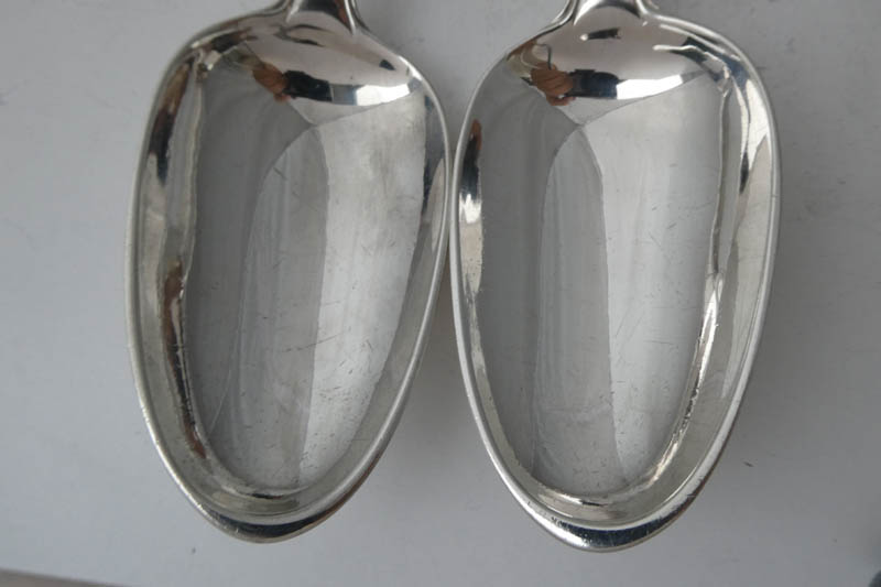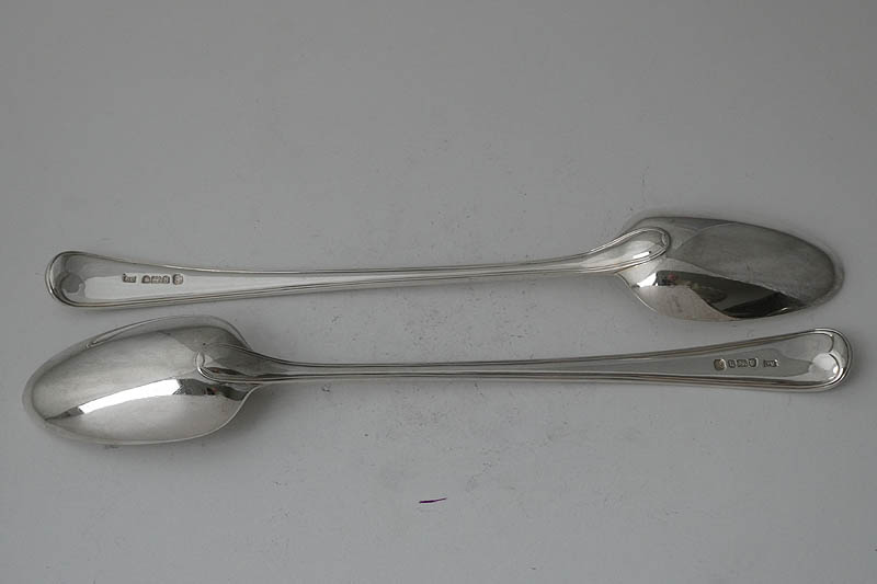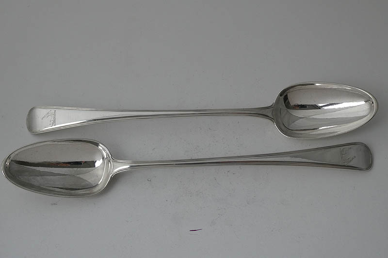 A pair of George III Old English Thread stuffing spoons of unusually heavy gauge (10 Troy Ounces the pair) made in London in 1785 by Richard Crossley, crested for Acland. Price: £995.00 The Acland and Hoare families were both wealthy and influential in the west of England and between whom there were a number of marriages in the 18th century. On 4th July 1785, Thomas Dyke Acland (1787-1871), eldest son of the 9th baronet of Killerton in Devon, married Henrietta Anne Hoare (1765-1841), daughter of the prominent banker Sir Richard Hoare 1st baronet of Barn Elms and owner of Stourhead in Wiltshire. It is tempting to suggest that these spoons, of exceptional quality, were part of the silver commissioned for this marriage. Stock numbers 9919 and 9920 on Antique silver ladles and sifters were also part of this service