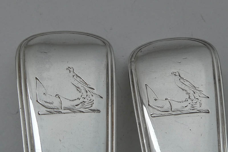 A George III pair of Fiddle Thread pattern salad servers made in London in 1812 by William Eley, William Fearn and William Chawner, crested with a hawk on a tower. Price: £525.00