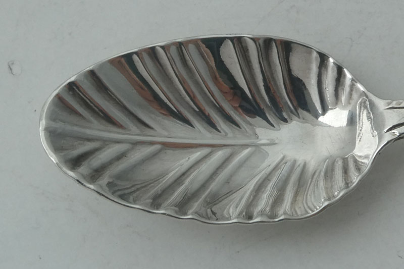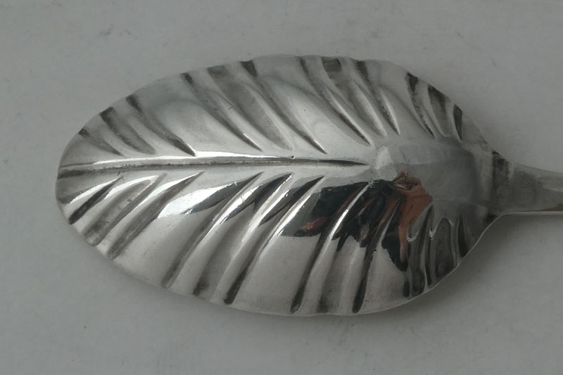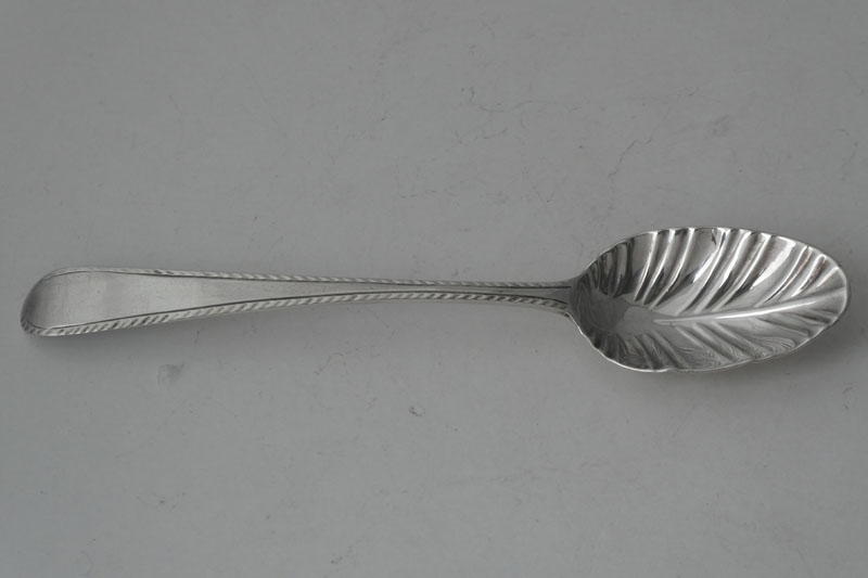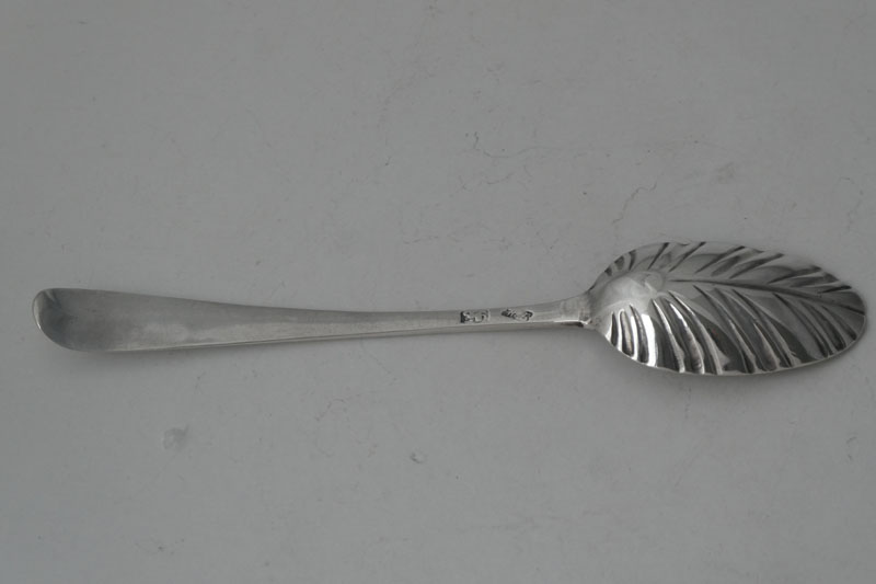 A feather-edge teaspoon with shaped stem and fluted bowl, London circa 1770 by IM (Grimwade 3658) for Jacob Marsh or John Moore, initialled {AJ} or {AT}. Two spoons from this set formed part of lot 99 of the Gubbins sale in 2002. |