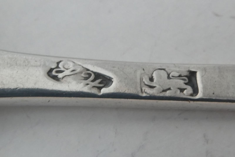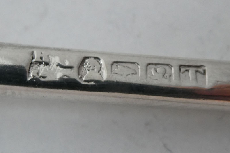A George III Old English pattern teaspoon made in Newcastle in 1797 (during the period of Double duty) by John Langlands, initialled {H [over] WE}. Price: £160.00 In 1797 the British government's need to raise money to prosecute the war against Revolutionary France meant that they doubled the duty on wrought plate (the term then used for items of silver). It was therefore necessary to make a change to the hallmarks to reflect this (as duty could be reclaimed if a piece was exported). In London and Exeter this was done by changing the shape of the duty mark but in Sheffield, Birmingham, York and Newcastle the change was made by striking the existing duty mark twice. In Newcastle, which produced 6,873 Troy Ounces or 214 kg during the period of the double duty mark, John Langlands was the most prolific of the silversmiths (producing 3,809 Troy Ounces or 55%). 2 spoons available