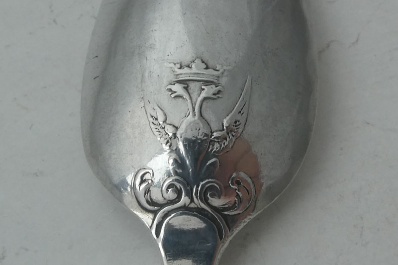 A George III Hanoverian pattern teaspoon with a double headed eagle back made in London circa 1760 by Thomas Woodhouse. Price: £25.00 The image of a double-headed eagle has long been associated with both the Russian and Prussian empires. The link between Britain and Prussia was much stronger than that with Russia in the eighteenth century- particularly during the Seven Years War (1756-1763). In 1756 the Diplomatic Revolution followed by the Treaty of Versailles created changes in alliances, leaving Britain and Prussia isolated in opposition to the old enemy, France, with its newly associated countries. In Britain there would have been a feeling of both support for, and possibly dependence on, Prussia in the new conflict. In this situation the emblem of the Prussian eagle combining with the rose or the crown, both representing Britain, would have had popular support.