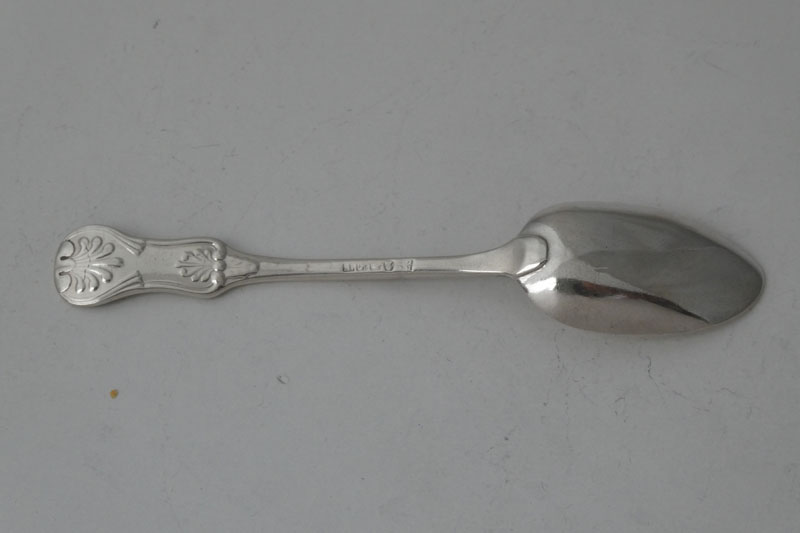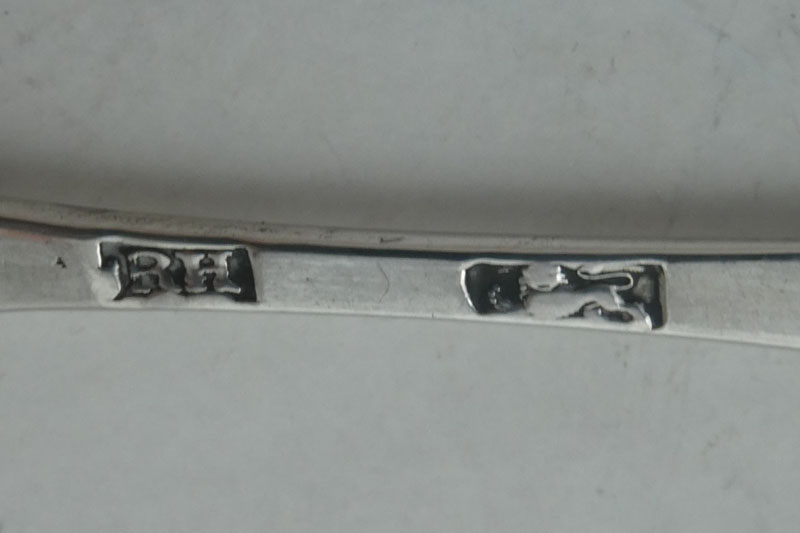 An oar-pattern teaspoon, by R.L. - perhaps attributable to Richard Lamb of Sydney, circa 1850, initialled {LJ}. The mark on this spoon shows similarities to a mark recently attributed to Richard Lamb by John Houstone and the shape of the fiddle pattern and style of the initials do have precedents in known Australian flatware — see Early Australian silver by J.M. Houstone, pages 77-8 |