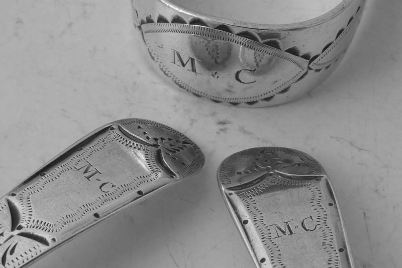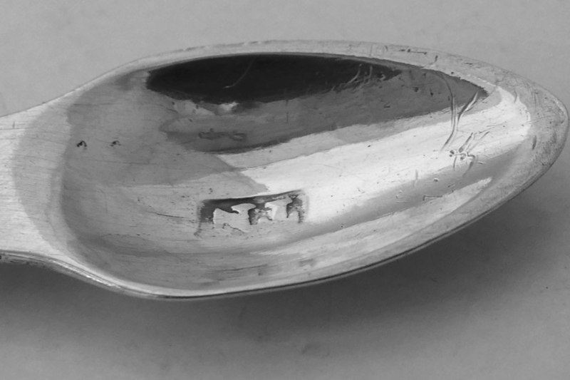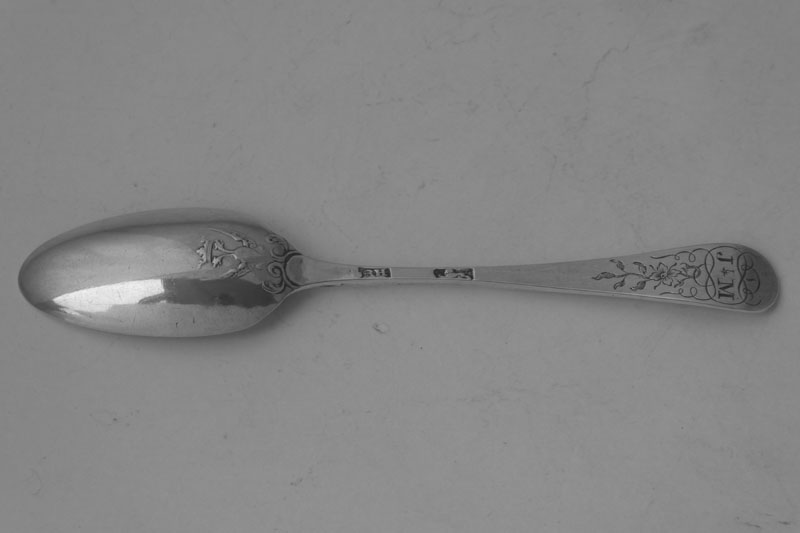 A George III Old English teaspoon with bright-cut decoration made in London in 1789, initialled {MNT} Price: £28.00 The triple initial and the orientation of the engraving along the stem could suggest that this spoon was exported to the Channel Islands or America. Provenance: Collection of A. B. L. Dove FSA