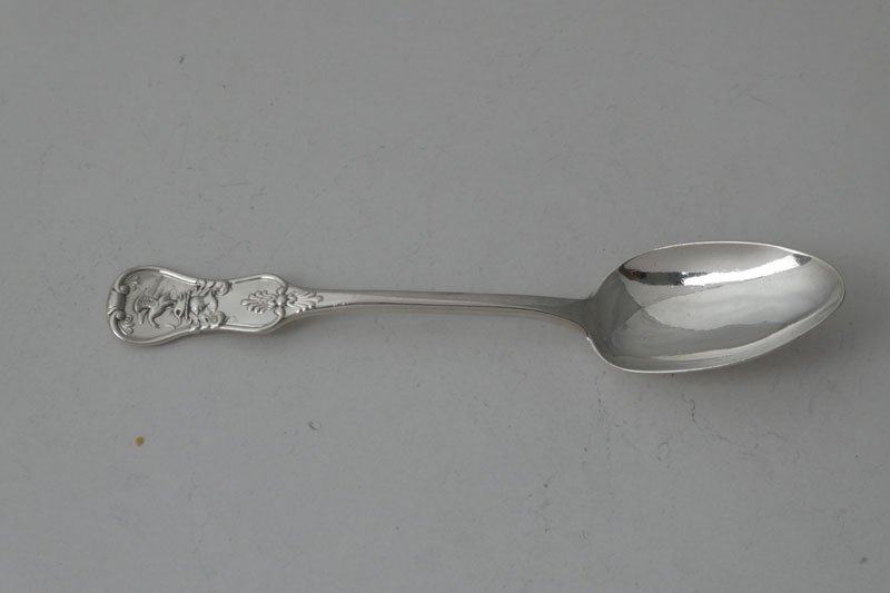 A George III King's pattern teaspoon made in London in 1820 by Paul Storr, crested with a demi dragon and initialled {EF} for a member of the Firmin family. Price: £165.00