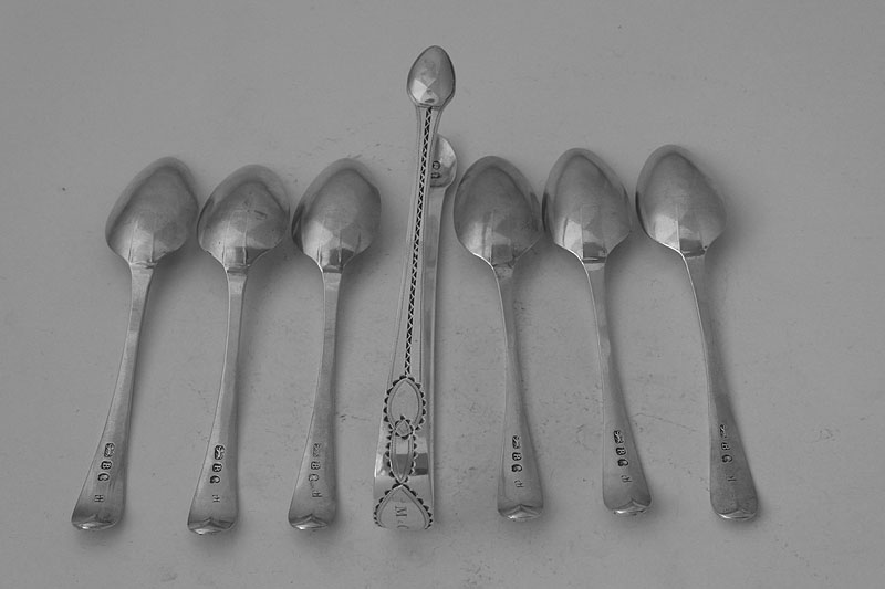 A set of six bright-cut teaspoons, by Richard Crossley London 1801 initialled {H} on the front and {ED} on the back. Price: £145.00 |