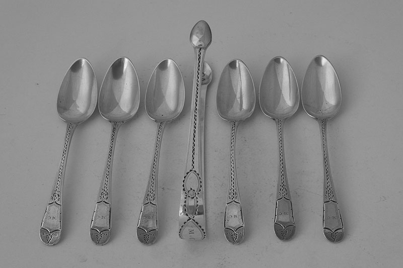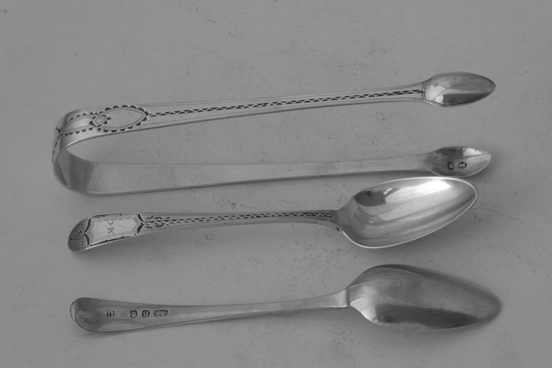 A George III set of six Old English pattern teaspoons with bright-cut decoration made in London in 1797 by Peter and Ann Bateman and matching tongs by Thomas Northcote, circa 1797, all initialled {MC}. Price: £285.00