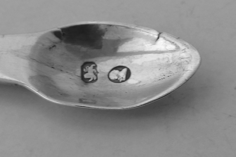 A George III Hanoverian pattern teaspoon with 'cotton plant' back, by James Dixon Chester circa 1780, initialled {C [over] RA} and S. TODI . English Fancy backs and pictureback teaspoons are rarely found hallmarked outside London (a notable exception being the distinctive form of the I Love Liberty back found in Exeter- itself rarely found). |
