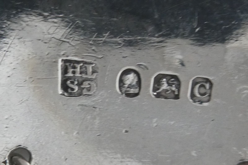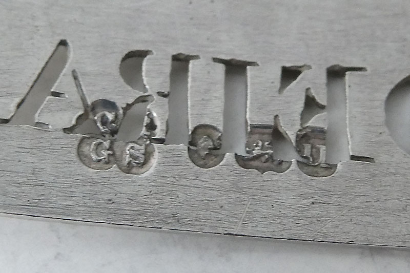 A George III wine label with thread-edge border engraved for WHITE WINE, by IW of Chester (John Walker of Chester or Joseph Walley of Liverpool) , c. 1800. Labels by Joseph Walley of Liverpool (d. 1801) are recorded. If it is by him the shape would suggest that it was a late example of his work. The other candidate for this mark is John Walker of Chester. He was the son of George Walker I of Chester and was born in 1782. John was made a member of the Goldsmiths' Company of Chester in 1808, having been apprenticed to his father, and succeeded his father as Assay Master on the latters death in 1809 (although he did not swear the oath of that office until 1819). In 1825 Walker described himself as Secretary (as well as Assay Master) and in 1834 he was admitted to the Company again 'according to ancient use and custom'. In 1840 he appears to have ceased his activities with the Goldsmiths' Company of Chester in the wider disgrace of his family. It certainly seems dubious for the son of the Assay Master (if this label were 1808-1809) or the Assay Master himself, if this label were made after 1809, to be avoiding assaying charges. John Walker is only known to have assayed four labels in his career and the whereabouts of these are currently unknown. |