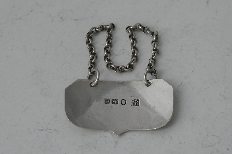 An Elizabeth II wine label with harp top engraved for WHISKY made in Sheffield in 2013 by Arthur Holder. Price: £145.00
