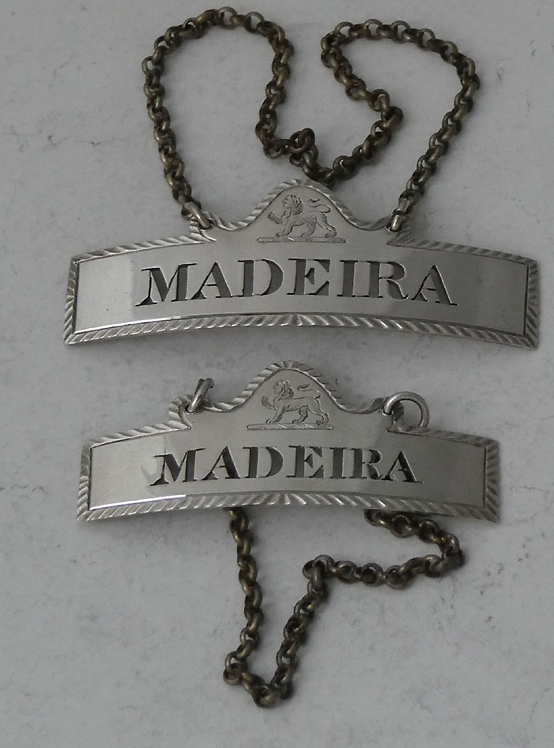 A pair of William IV hump top wine labels with feather-edge borders in graduated sizes both pierced for MADEIRA made in London in 1835 by Charles Reily and George Storer, crested with a sphinx passant. Price: £565.00