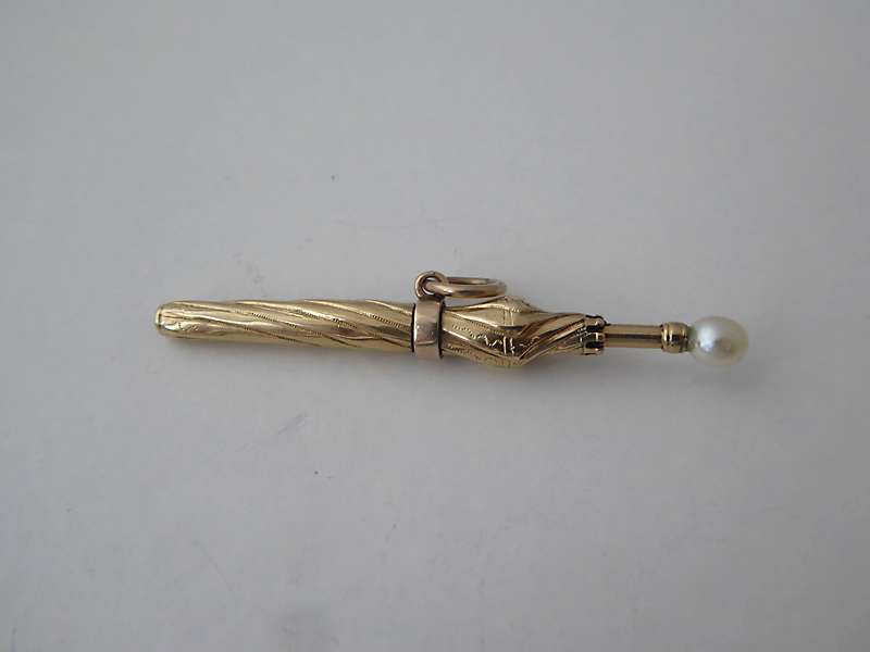 | A gold pencil modelled as an umbrella with a pearl forming the handle, unmarked circa 1860 . Price: £385.00 |