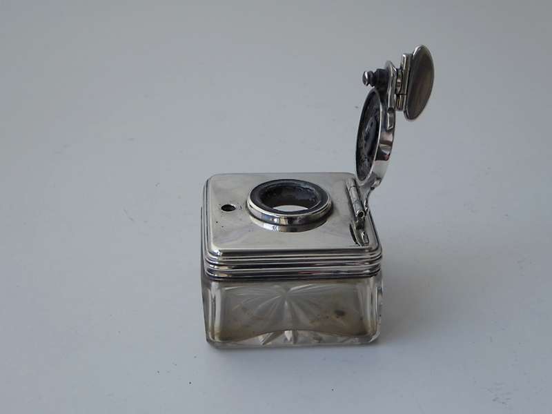 A William IV glass inkwell with silver 'Berry's Patent' lid, by Henry Berry London 1832 . According to the available literature Berry is recorded as producing travelling inkwells with this mechanism as early as 1832, the date of this example. They were still being advertised in 1853. |