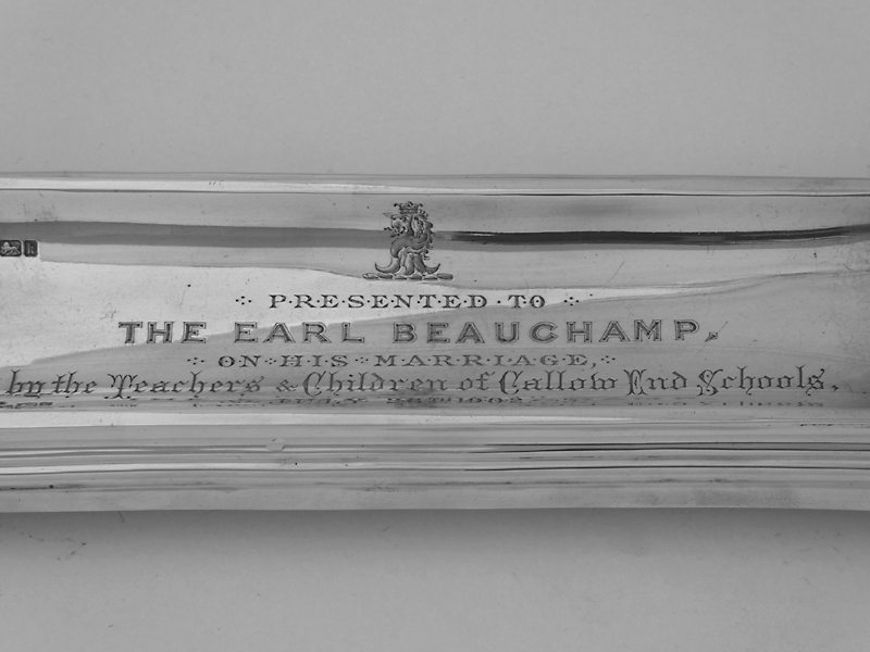 An Edward VII pen tray made in Sheffield in 1902 by Hawkesworth, Eyre and Company (retailed by George Birley and Company of Worcester), presented to Earl Beauchamp by the Teachers and Children of Callow End Schools for his marriage on July 26th 1902. William Lygon, 7th Earl Beauchamp (1872-1938) inherited the family title and estates in 1891. Following education at Eton College and Christ Church, Oxford (where he was President of the Oxford Union in 1893) Beauchamp served as Mayor of Worcester from 1895-1896. He then began a national political career involving the Governorship of New South Wales (1899-1902), being appointed a Privy Councillor and Captain of the Gentleman at Arms in 1906, Lord Steward from 1907-1910 and President of the Council in 1910. In 1902 Beauchamp married Lady Lettice Mary Elizabeth Grosvenor, daughter of the 1st Duke of Westminster, in 1902 (the event for which this pen tray was presented to him) but in 1931 it became publicly known that Beauchamp was homosexual and he went into self imposed exile on the continent. The departure of the Earl left his estates and houses occupied by his wife and six children. His second son, the Hon. Hugh Lygon, was a contemporary at Oxford of Evelyn Waugh and through their friendship Waugh often stayed at Madresfield, the Worcestershire estate of the Lygon family. Waugh based many of the situations and characters in Brideshead Revisited on the Lygon family (the Chapel at Madresfield is a clear inspiration for that at Brideshead).